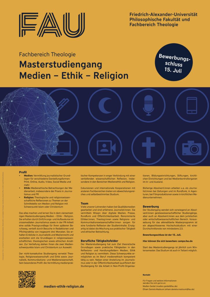 20. April 2026 Aktuelles Masterstudiengang Medien – Ethik – Religion Bewerbungsschluss 15. Juli ⛶ Zuletzt aktualisiert: 20. April 2026 - 13:31